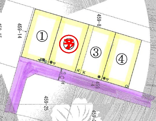 | 備考 | ・区画1、4に電柱及び支線が入ってます ・地元町内会に加入のこと(地元町内会のゴミ集積所の利用となります) |