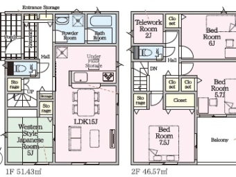 | 建物面積 | 1F:51.43㎡ 2F:46.57㎡ 計:98.00㎡(29.64坪) |